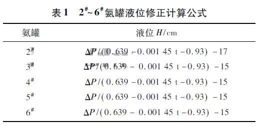 因液氨密度受溫度影響大,且每個氨罐的保溫效果也有差異,故如需準確測量氨罐液位,必須引入溫度測量。對2#~6#氨罐分別進行卸壓,并引入熱電偶遠傳至DCS系統(tǒng),對密度進行修正,修正公式為Q液=0.639-0.00145t。經(jīng)過以上修正,2#~6#氨罐液位修正計算公式