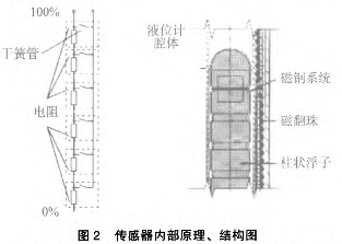 傳感器的作用是采樣液位高低位置并轉換成標準信號傳送至控制室,傳感器實際由干簧管和電阻組成。當浮子內磁鋼位置變化后,磁場通過器壁帶動傳感器內干簧管觸點吸合。干簧管吸合的位置決定回路的阻抗大小,干簧管的通常位置為10mm1組?;芈返拇笮≌门c液位的高低成正比,這樣*后由置于傳感器外殼內的變送器將電阻信號轉換成標準的電流信號,送至控制室。具體結構、原理圖見圖2。