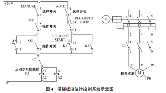 現場安裝石灰液位計時, 裝置標尺的0 位, 對應的實地高程為EL .40 .0 m 。浮子開關設定5 個水位動作值, 檢修水位低開關量報警值對應的高程為40 .3 m ;停止所有檢修水泵的開關量, 所對應的高程為40 .5 m ;啟動主用檢修水泵的開關量, 所對應的高程為40 .9 m ;啟動檢修水泵主用泵的開關量, 以及要求手動啟動大泵, 并作為水位高報警上送上位機, 所對應的高程為41 .1 m 與41 .2 m , 兩個開關量并列接入。全部開關量分別送入PLC , 如圖3所示。