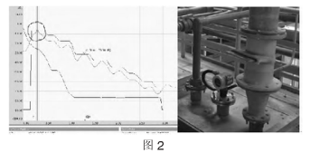 圖5為鈷礦漿化槽液位達到2.3m(量程3m)時回波包絡(luò)線圖。該液位計在投產(chǎn)初期一直正常使用,但經(jīng)過1個月后,液位發(fā)生異常波動的情況越來越頻繁,分析回波曲線后,發(fā)現(xiàn)在較低的液位(2.3m)時,回波強度也比較弱(30dB)。拆下液位計檢查后發(fā)現(xiàn)液位計表面附著了一層黑色的礦漿,導(dǎo)致液位計無法正常工作。