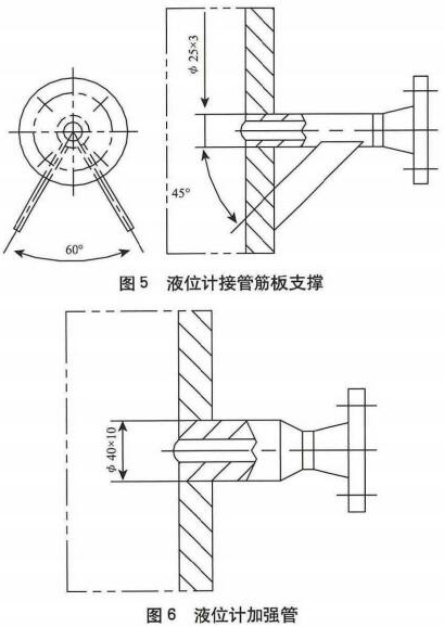 圖5是泄漏襯四氟磁翻板液位計接管結構,雖然必25mmx35mm接管的開孔補強滿足GB150-1989標準[11“開孔不另行補強”的要求,但卻不符合現行標準GB/T150-2011的“開孔不另行補強”要求。因為,兩標準雖然限制的設計壓力(<2.5MPa)與接管外徑(<89mm)等條件相同,但是后者改版標準卻對接管壁厚及腐蝕裕量增加了要求,這是合理的改進完善。對于本例的425mm接管,滿足GB/T150-2011的“開孔不另行補強”條件的管壁厚度至少應為5.5mm(按標準規定當腐蝕裕量為1mm時,接管厚度應不小于3.5mm)。所以,按HG/T20583-2011對小接管避免彎曲而推薦的加強結構優先選用加強管形式建議將液位計接管更改為圖6的加強管結構。這樣不但解決了小接管的開孔補強和防彎曲加強問題,也可以使小接管的設計使用年限與罐體一致,而且便于保證小接管與罐體采用插人式全焊透角焊縫的焊接質量。
