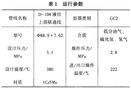 該裝置于2016年9月開工轉人正常運行,2016年9月7日發現D-104液面計上引出線有冒油氣現象,現場檢查發現D-104液面計上接管引出線法蘭后焊縫靠上部有裂紋現象,車間對泄漏部位進行帶壓鉚擊消漏處理。9月8日該部位再次出現泄漏,裝置停工隔離處理(表1)。