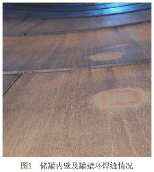 儲罐結(jié)構(gòu)型式為拱頂罐,罐壁的環(huán)焊縫為搭接結(jié)構(gòu),其罐壁的焊縫均沒有進(jìn)行處理,有一定的焊縫余高,罐體內(nèi)直徑隨著高度的增加直徑在變小。儲罐原為原油儲罐,雖然經(jīng)過蒸汽吹掃,罐壁上仍附著油污,罐內(nèi)的防腐層破壞嚴(yán)重。儲罐在制造時(shí),對鋼板的內(nèi)表面要求處理的粗糙度等級不高,使內(nèi)壁殘留許多小的焊瘤、焊渣等,該類殘留物部分有鋒利的銳角。其具體情況如圖1所示。