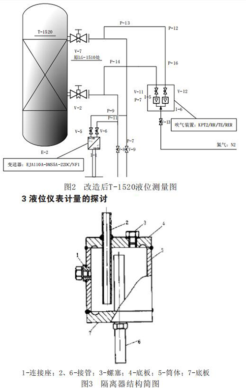 以溶劑吸收工段吸收塔T-1520為例,將該塔處的就地醋酸液位計改為反吹法測量液位,并且至中控室,使得T-1520原有的醋酸液位計LT-1510多一道對比和參考,對生產工藝的操作更有參考價值。