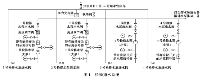 桐柏電站的檢修排水系統,共設4臺排水泵,如圖1所示,1號、2號檢修水泵(大泵)用于排空引水隧洞、蝸殼、尾水管、尾水隧洞內的水;3號、4號檢修水泵(小泵)用于球閥、上下庫閘門等的滲漏排水。每臺檢修水泵均配置逆止閥、壓力表和帶流量開關的示流信號器,在1號、2號水泵出水管處各安裝了一個流量調節閥。系統中共有2根總管,一根為水泵的總吸水管,包括從每臺機組尾水管底部至總管的支管,總吸水管和部分支管及管路上的操作閥門布置在廠房管路廊道中;另一根為總排水管,可將水排至滲漏集水井中,再經滲漏排水泵排至下庫。