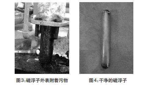 經過兩年多運行,污水罐內可能沉淀污泥雜質導致液位計示數不準。現場拆卸液位計,并且對浮球和磁浮子進行清洗。(圖3-圖4)