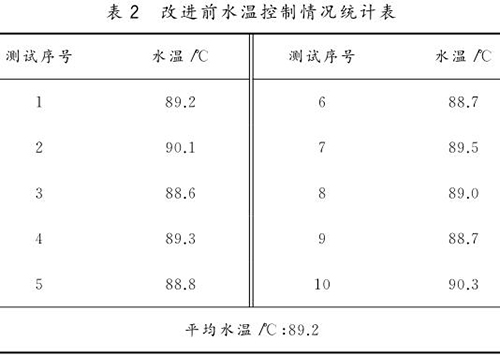 根據生產標準設定水溫為85℃,進行了10次測試,平均水溫為89.2℃(見表2),超出了設定溫度4.2℃。