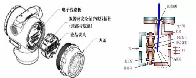 雙法蘭差壓變送器結(jié)構(gòu):主要部件為傳感器模塊、電子元件外殼、毛細管、高低壓側(cè)法蘭及膜片。傳感器模塊包括充油傳感器系統(tǒng)(隔離膜、充油系統(tǒng)和傳感器)以及傳感器電子元件。
