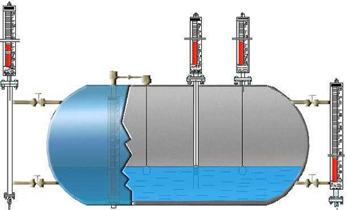 液位計根據浮力原理,浮子在測量管內隨液位的升降而上下移動,浮子內的永久磁鋼通過磁耦合作用,驅動紅、白色翻柱翻轉180’液位上升時,翻柱由白色轉為紅色,下降時,翻柱由紅色轉為白色,從而實現液位的指示。